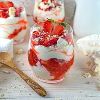 - In Gläser das Dessert Schichten: Zu unterst etwas Meringue zerbröseln, dann die Mascarpone Creme, danach die Erdbeeren. Dann wieder Meringues zerbröseln usw usw.