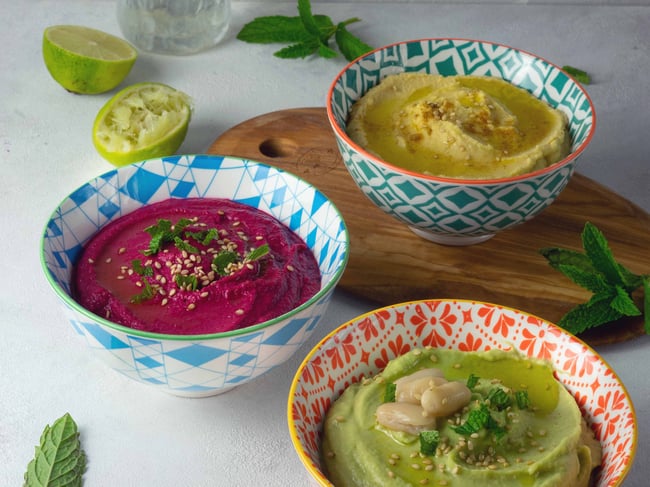 Hummus stammt aus der orientalischen Küche und besteht aus Kichererbsen, Zitronensaft, Olivenöl, Kreuzkümmel und teilweise aus der Sesampaste Tahini. Ich verwende jedoch die letztere Zutat nicht und mache ihn simpel. Schmeckt einfach lecker und benötig somit wirklich nur ganz einfache Zutaten. Die Nature Version ist wohl die bekannteste und beliebteste. Die pinke Version verdankt ihre Farbe der pürierten Rote Beete und der letzte im Bunde ist das Avocado Hummus mit Kichererbsen und Bohnen. Total lecker!