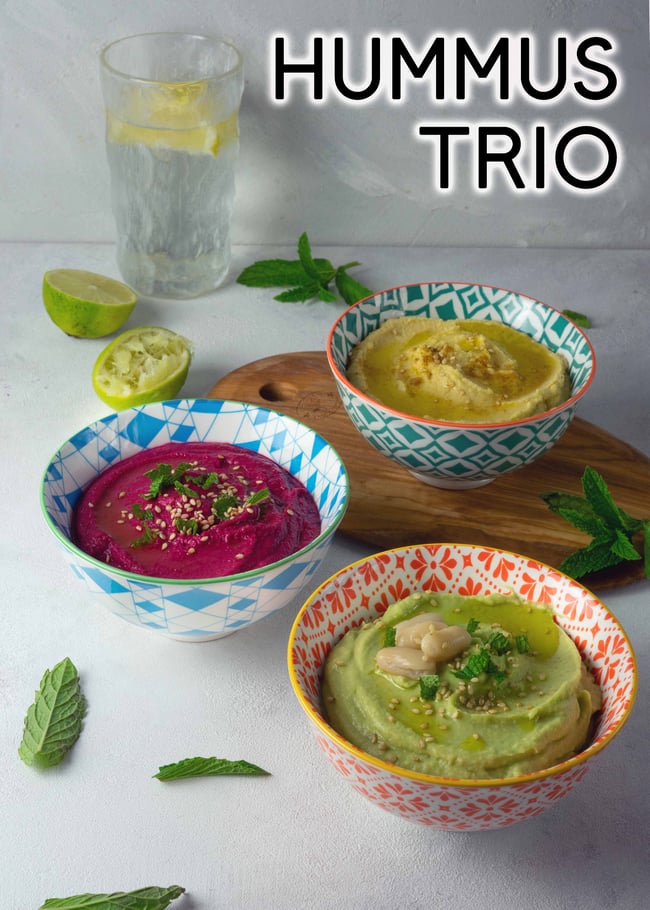 Durch die tollen Farben isst auch das Auge mit. Ausserdem ist das Rezept total einfach und das Hummus Trio ist in nur wenigen Arbeitsschritten bereit.
